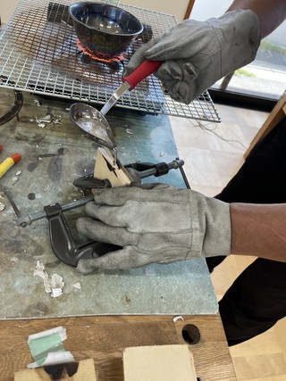 時間をおくとスズが固まり、糸ノコで切り取った形が出来ます。その後、箸が置きやすいよう金づちで丸みをつけ、ブラシで磨き、素敵な箸置きが完成しました。