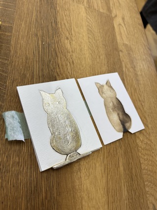 厚紙にデザインを描き、糸ノコで切っていきます。そして厚紙を木で押さえ、切り抜いた厚紙部分に熔かしたスズを流し込みます。